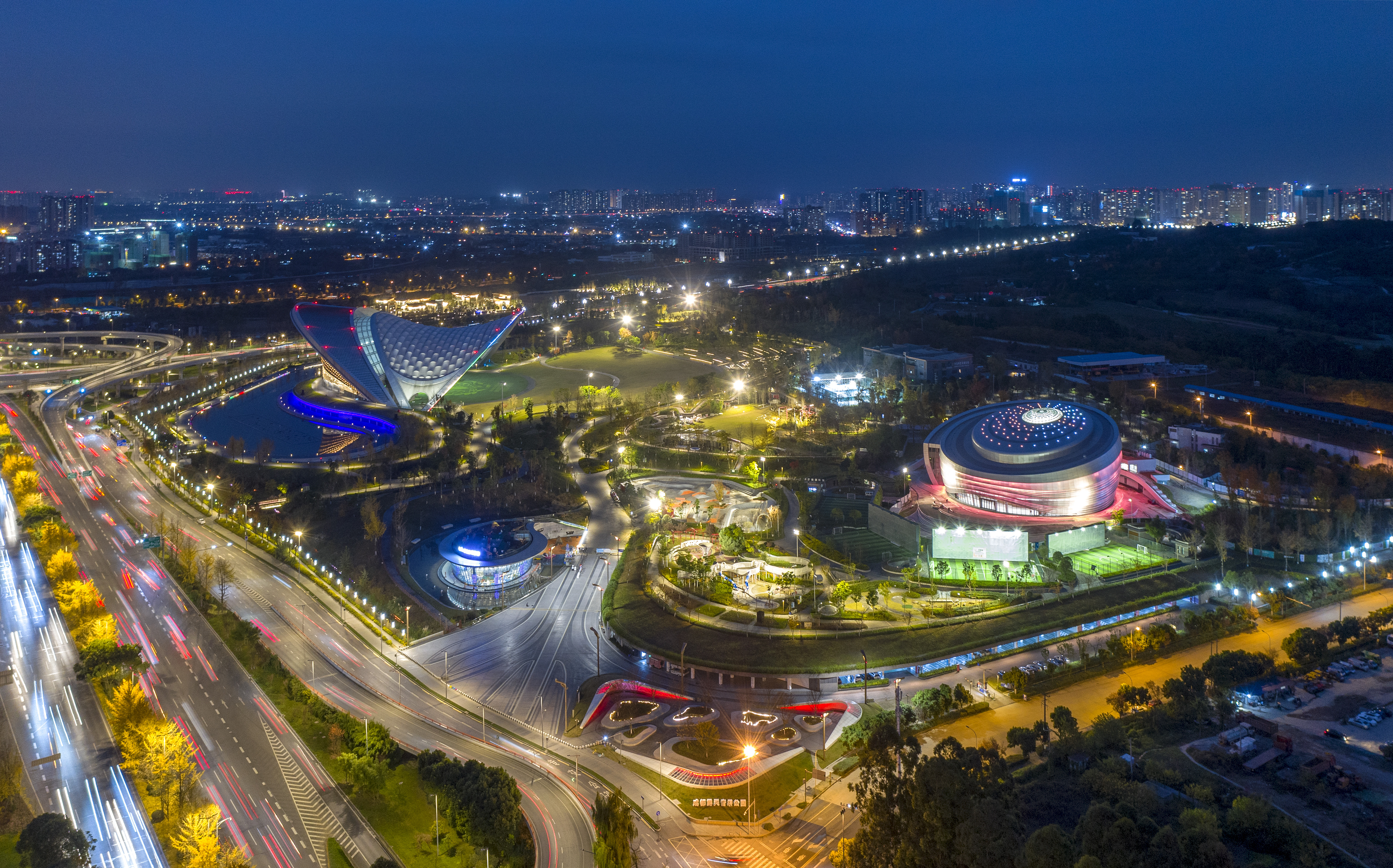 由中國十七冶承建的蘭州奧體中心,采用“飛天花舞”設計理念,建筑猶如五朵花舞動于絲綢之路上,總建筑面積46.6萬平方米,由60000座玫瑰體育場、8000座郁金香綜合館、3000座百合游泳館、3000座荷花網球館、蘭花運動員公寓等單體組成。其中郁金香綜合館弦支穹頂是世界上首個吊掛大噸位斗形屏(40t)的矢跨比小于1/12的90米級大跨度弦支穹頂結構工程。